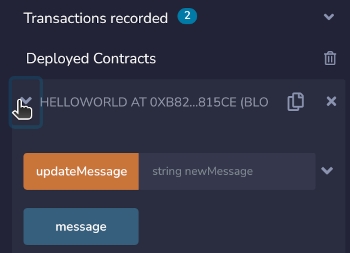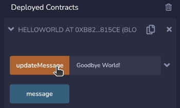 Because you deployed the contract to an actual blockchain, several nodes on the test network confirmed your payment for the smart contract. The contract, its variables, and its functions remain in the blockchain permanently. To change the message variable that is stored with your contract, run the updateMessage function.